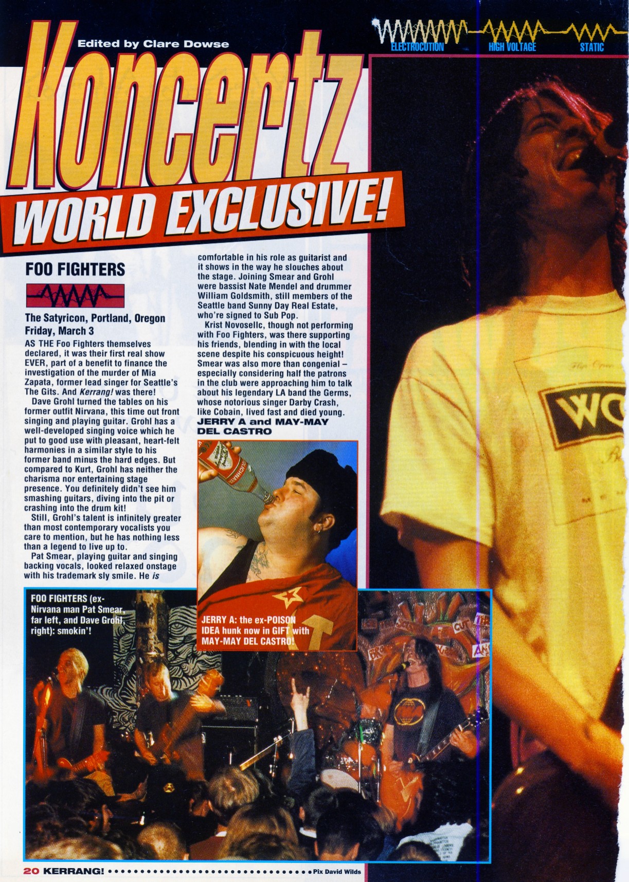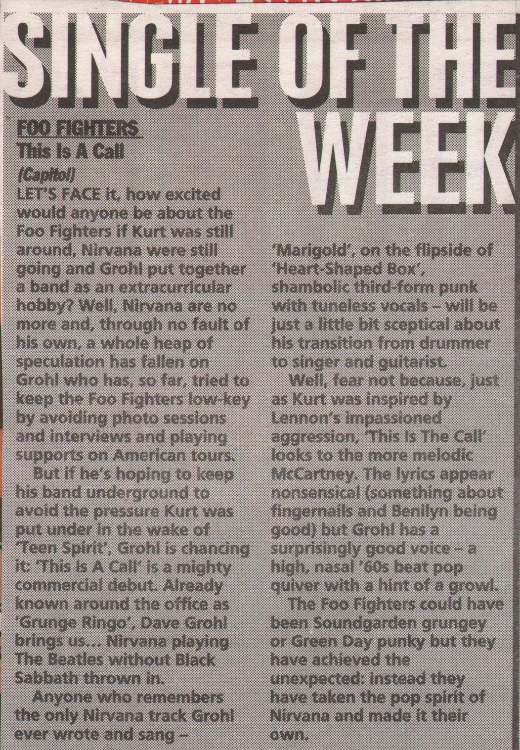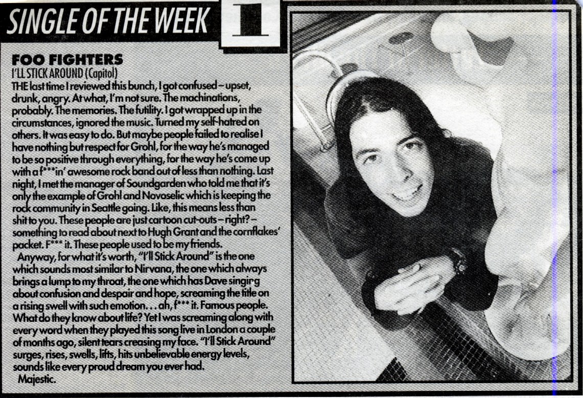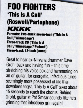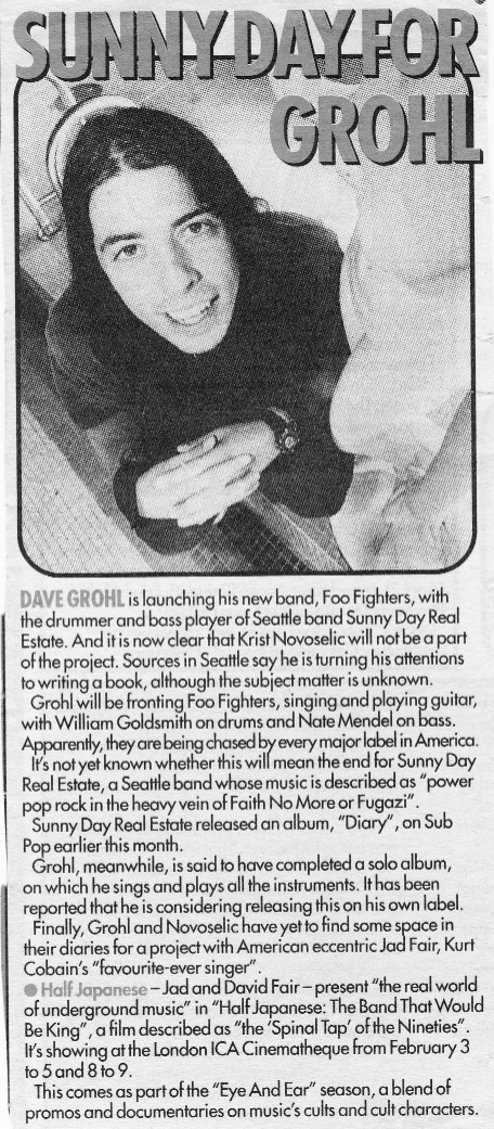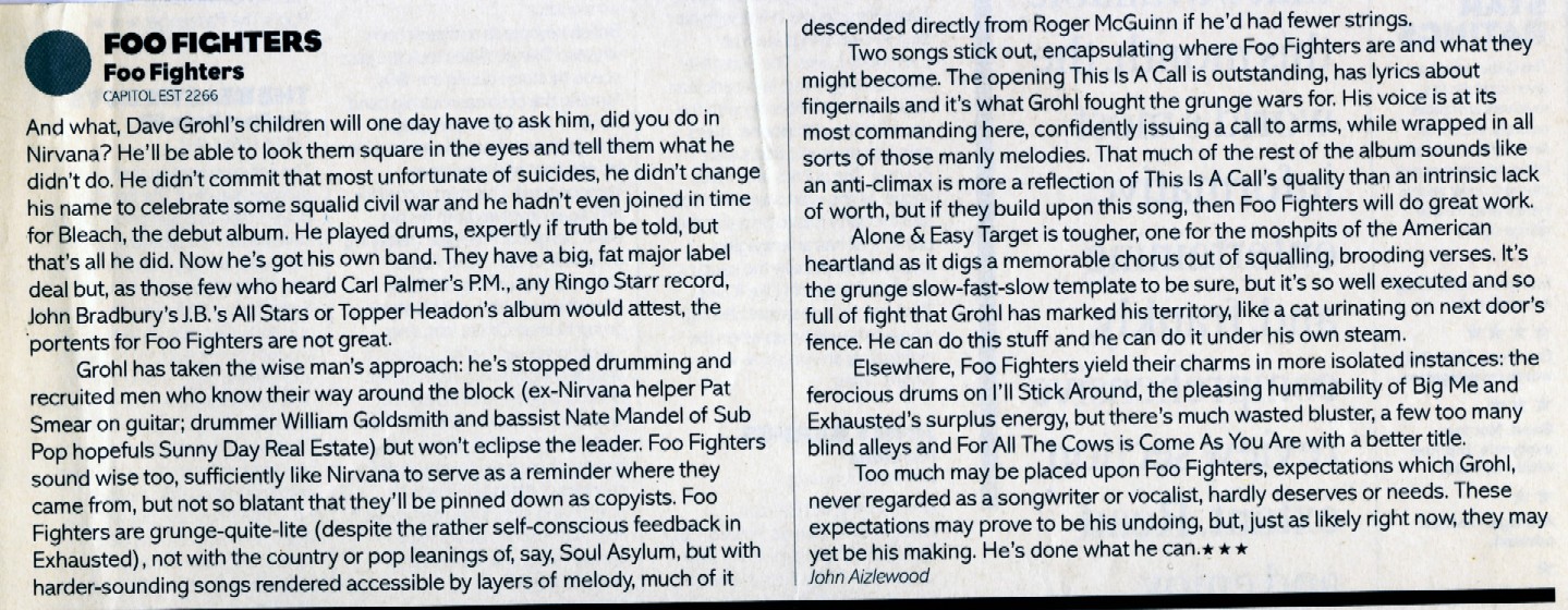 The following scans are news items and reviews from the UK press covering the rumours that Dave was planning a post-Nirvana band, right up until the release of the debut album. It makes for interesting reading, from the mistakes and inaccuracies when reviewing the demo tape to Kerrang's review of the first UK gig being more concerened with Dave's toilet than the music (and the journalist responsible is now the editor of Q). Some of these magazines are still around (Q, Kerrang!, NME) and some of them aren't (Vox, Raw, Melody Maker).