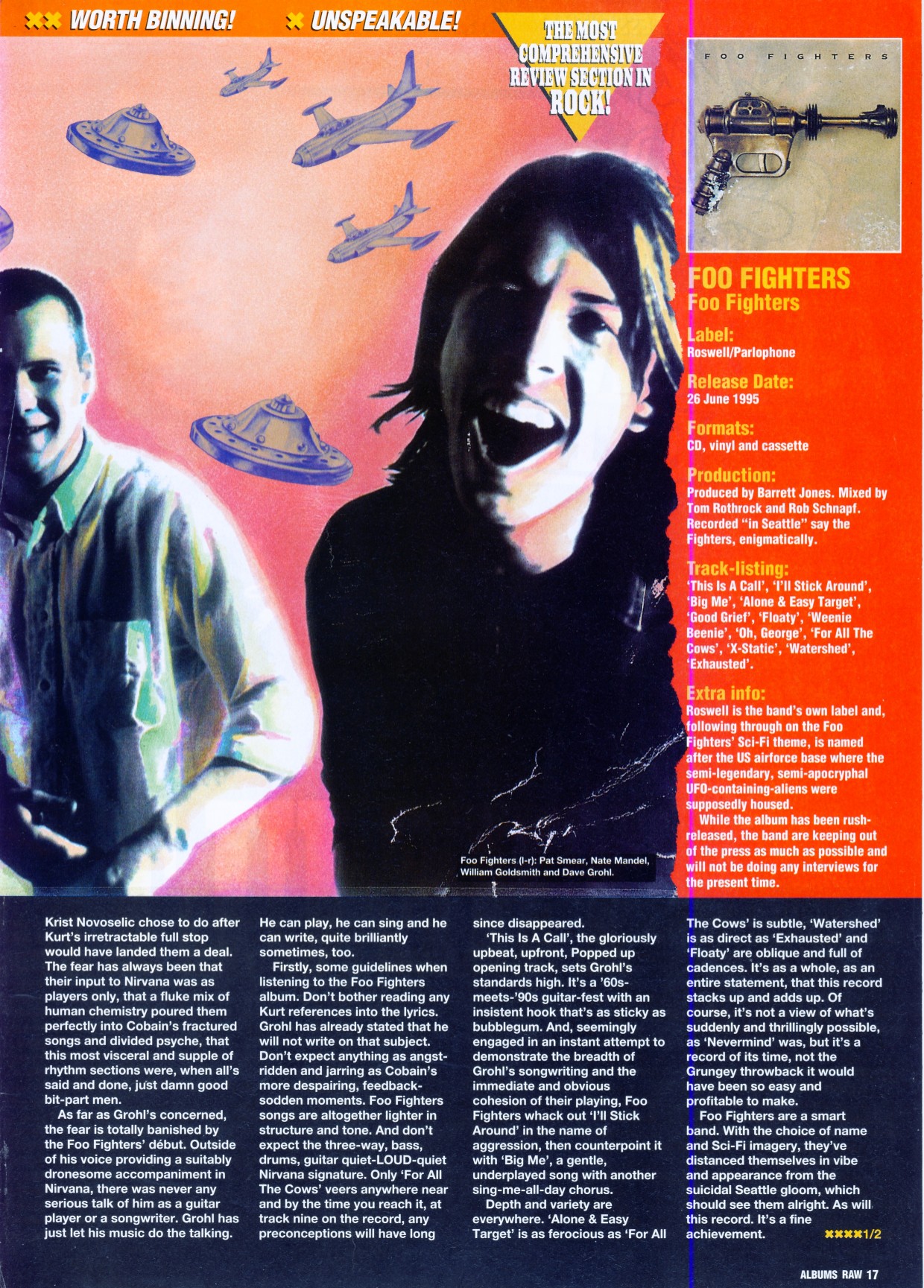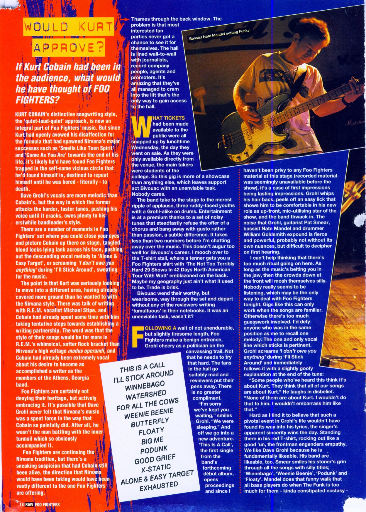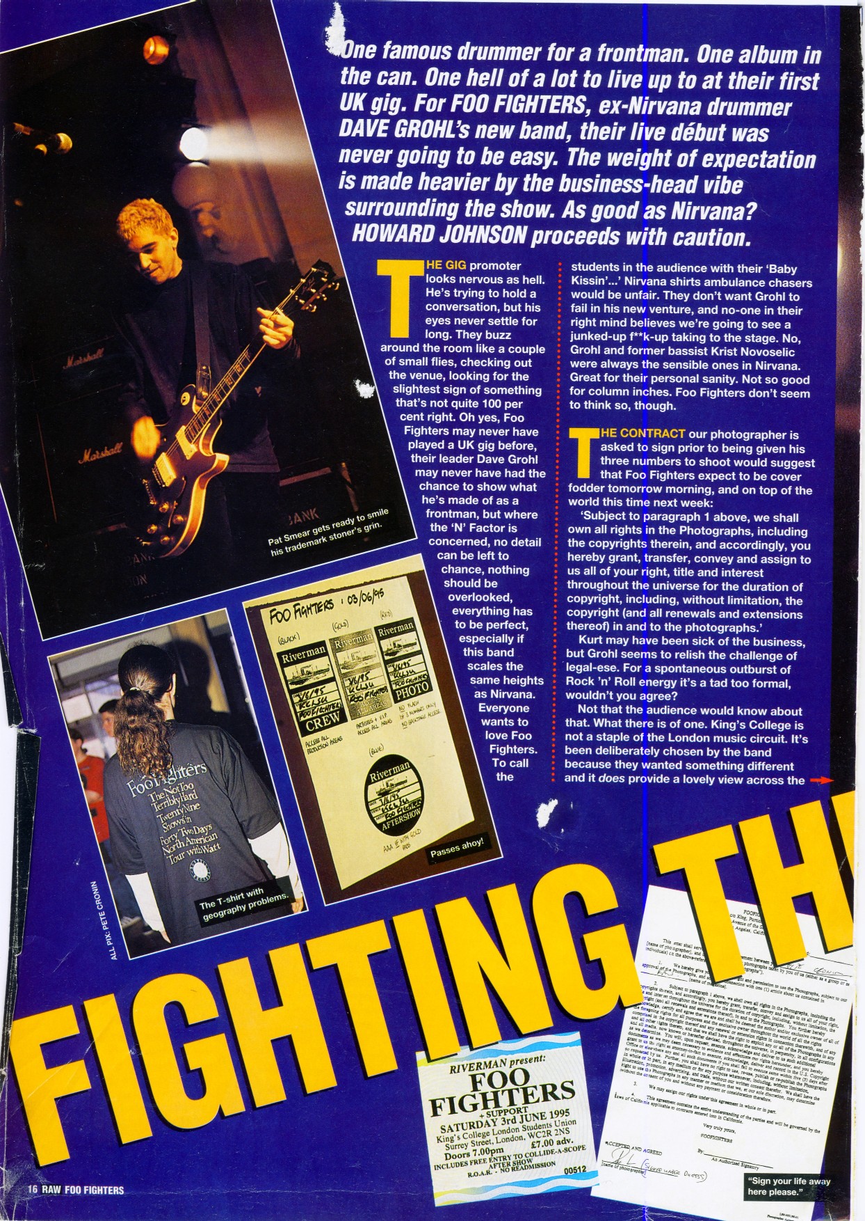 The following scans are news items and reviews from the UK press covering the rumours that Dave was planning a post-Nirvana band, right up until the release of the debut album. It makes for interesting reading, from the mistakes and inaccuracies when reviewing the demo tape to Kerrang's review of the first UK gig being more concerened with Dave's toilet than the music (and the journalist responsible is now the editor of Q). Some of these magazines are still around (Q, Kerrang!, NME) and some of them aren't (Vox, Raw, Melody Maker).